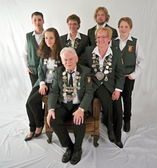 v. L.: 2. Jugendritter Alexander Pfeffer, Jugendkönigin Marina Schneider, Ehrenkönig Rudi Gies, 1. Ritterin Helga Schneider, Schützenkönigin Monika Storch, 2. Ritter Michael Nemluvil, 2.