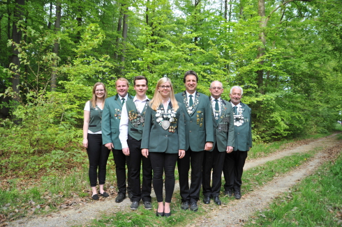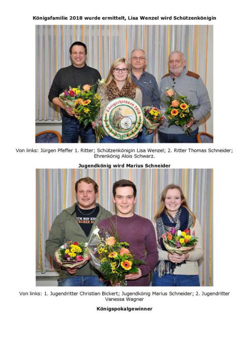 Das Foto zeigt von links stehend: 2. Jugendritterin Vanessa Wagner, 1. Jugendritter Christian Bickert, Jugendkönig Marius Schneider, Schützenkönigin Lisa Wenzel, 1. Ritter Jürgen Pfeffer, 2. Ritter Thomas Schneider und Ehrenkönig Alois Schwarz.