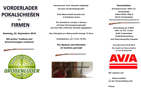 Am Samstag, 22. September 2018 findet das 1. Vorderlader Pokalschießen für Firmen im Schützenhaus Großenlüder statt.